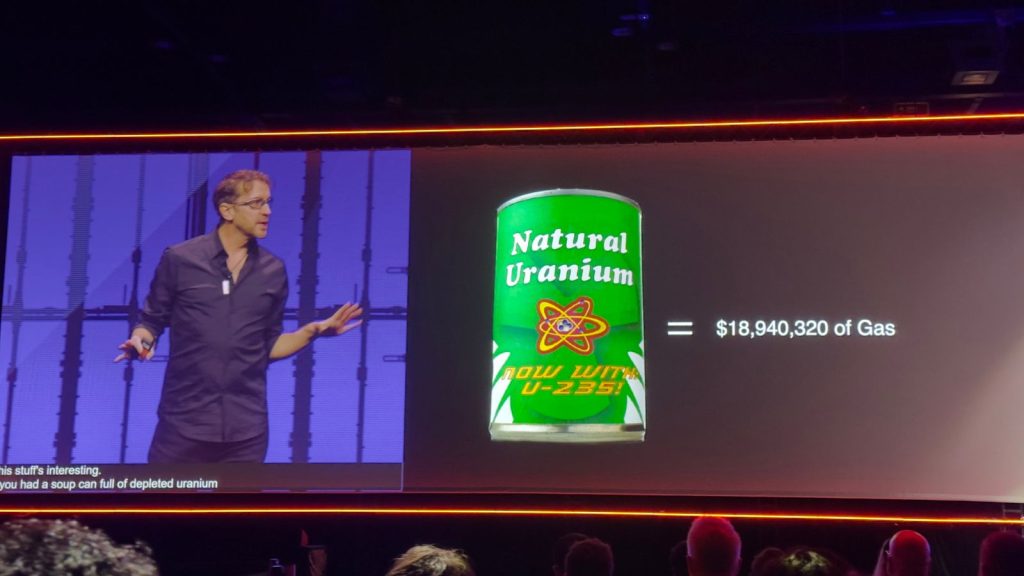 “Encontrei uma equipe que inventou um novo design de reator nuclear. Cabe em um bueiro. Eles o enterram a uma milha de profundidade em um furo. É inquestionavelmente seguro — está enterrado sob 10 bilhões de toneladas de rocha. Está a uma milha do quintal de qualquer pessoa. Nada pode dar errado. E mesmo se algo acontecesse, não haveria radioatividade na superfície.”